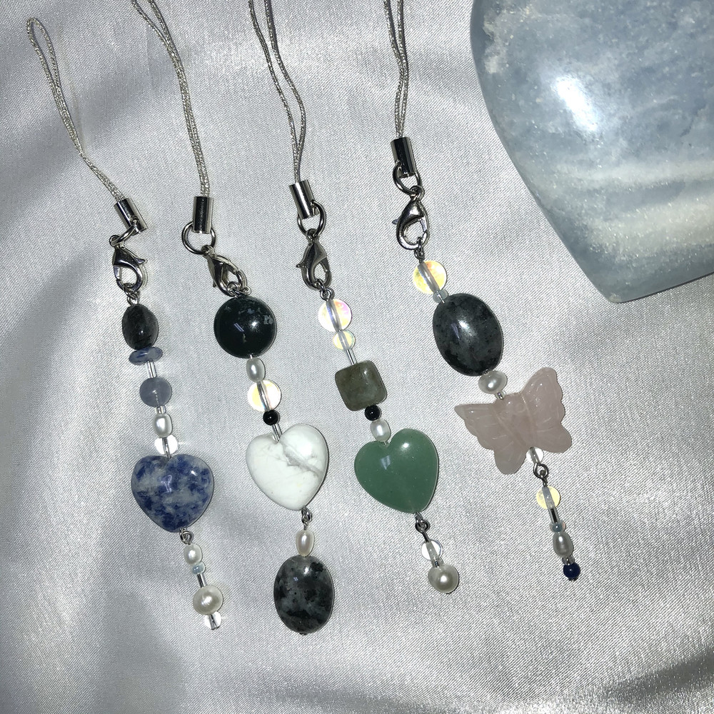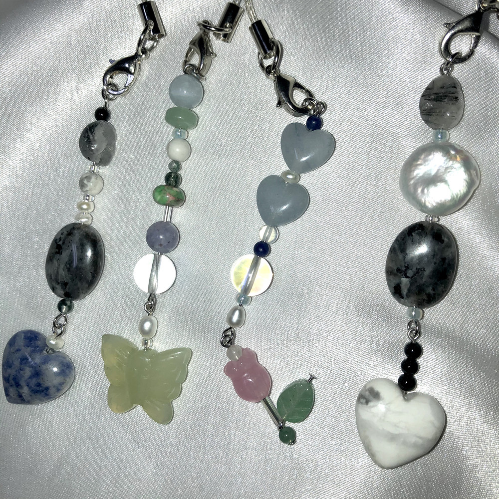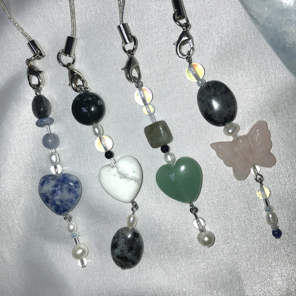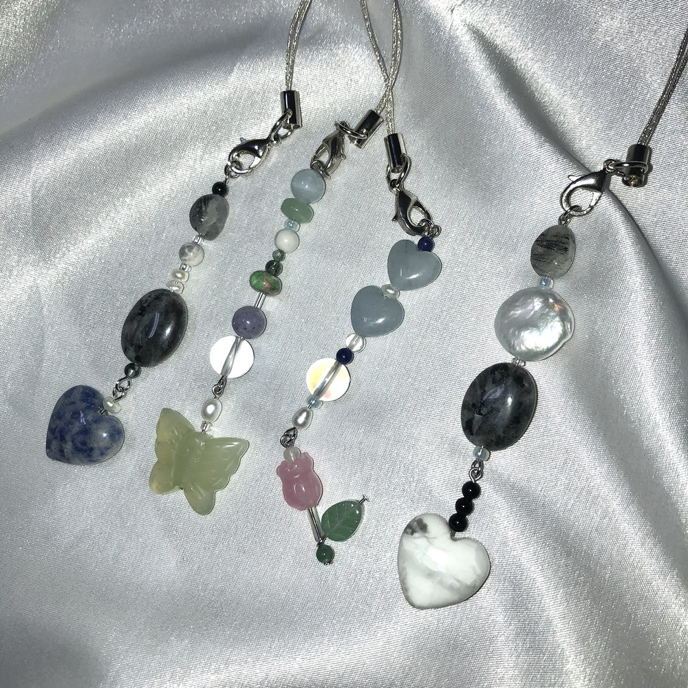 다른 곳에서 볼 수 없는 독특하고 불규칙한 디자인으로 다양한 천연원석과 진주로 포인트를 줘서 가방,휴대폰,바지등등