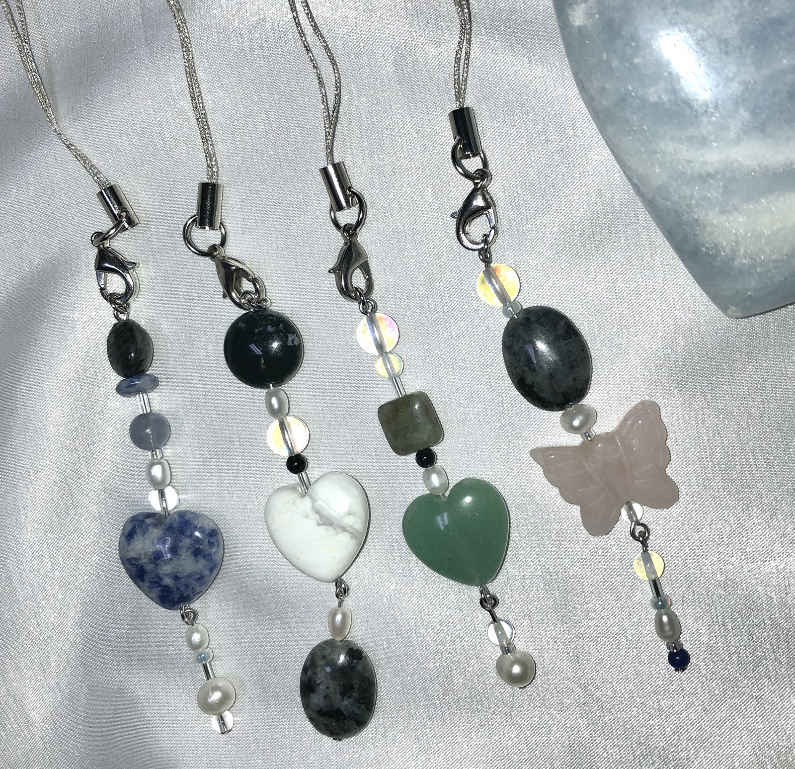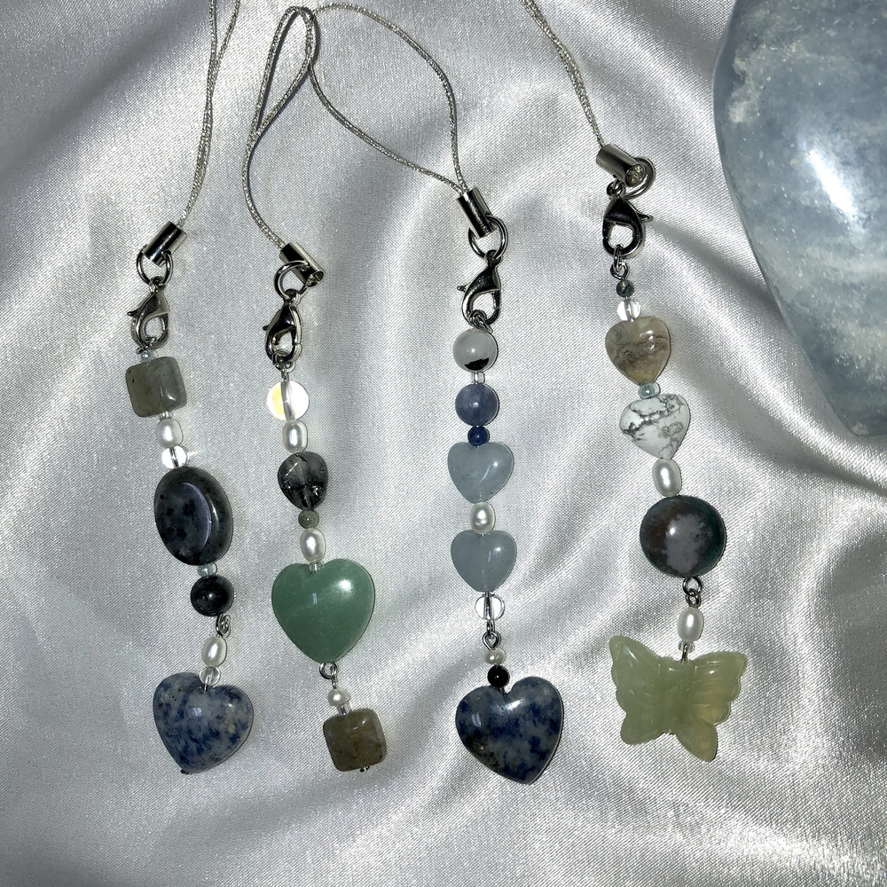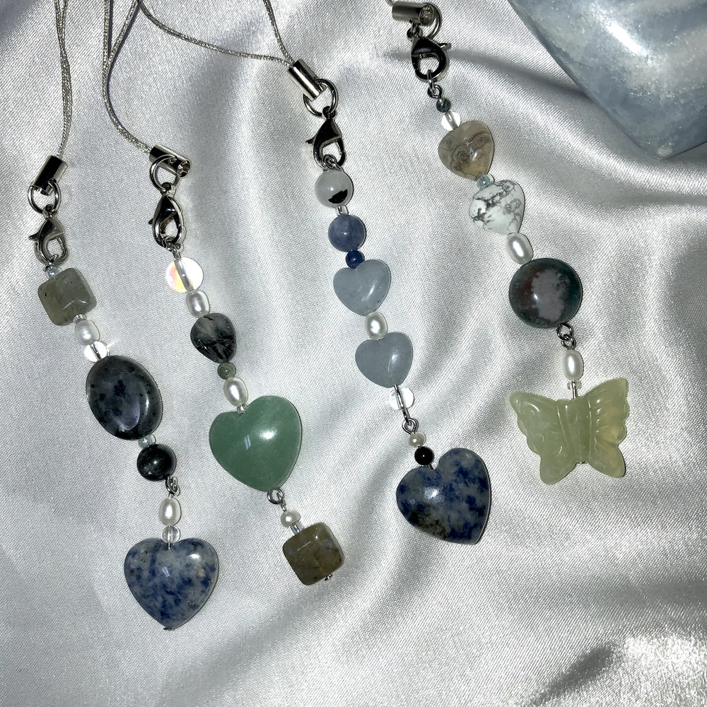 다른 곳에서 볼 수 없는 독특하고 불규칙한 디자인으로 다양한 천연원석과 진주로 포인트를 줘서 가방,휴대폰,바지등등