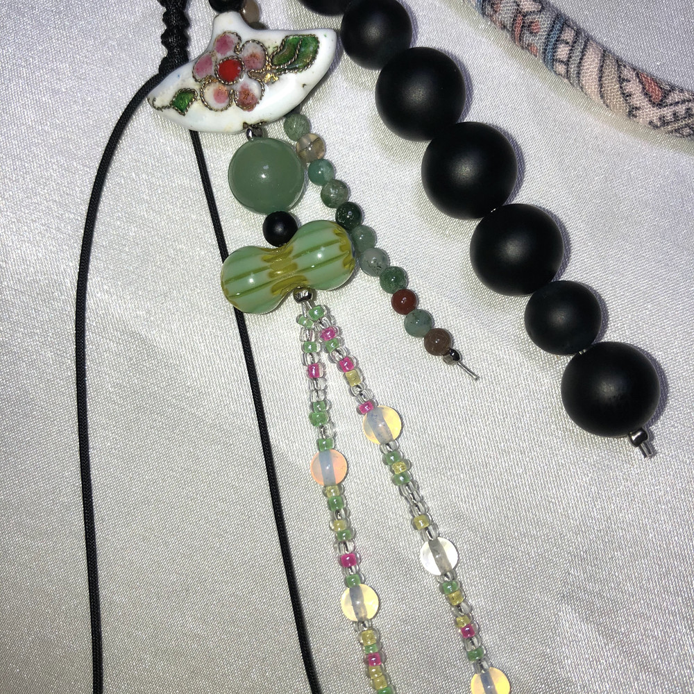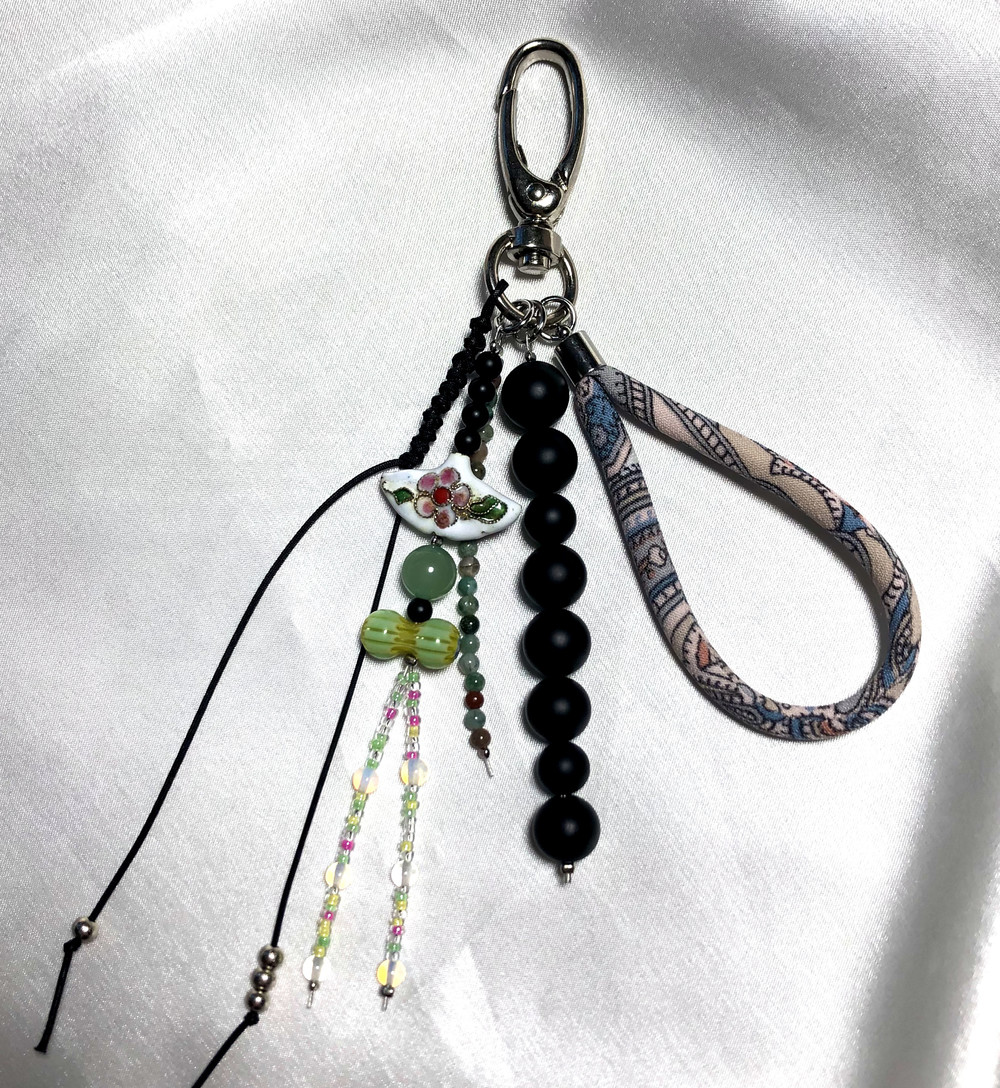 부채꼴 모양의 칠보 챰에 베네치아와 원석 투명한 비즈를 조합해서 만든 가벼운 키링입니다.