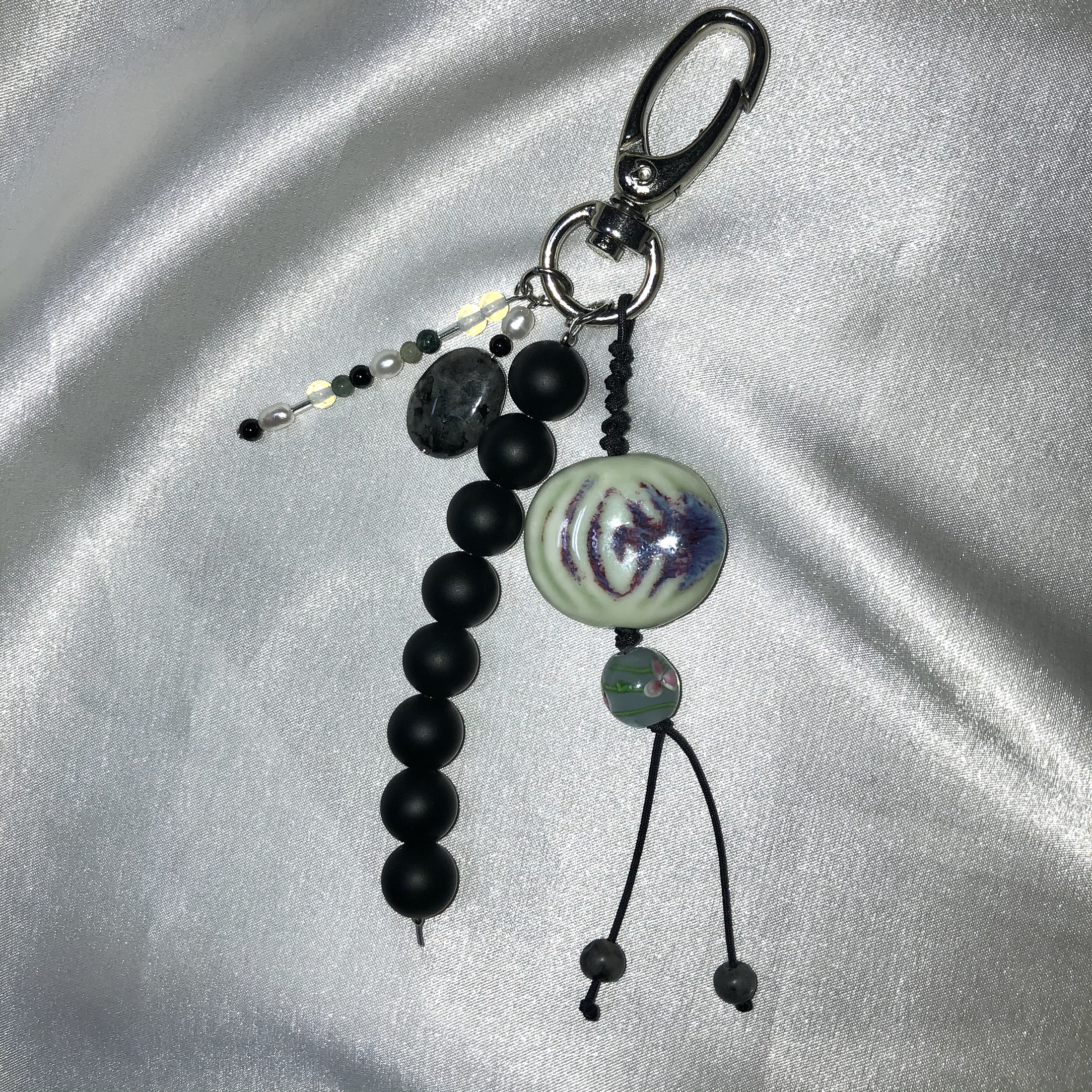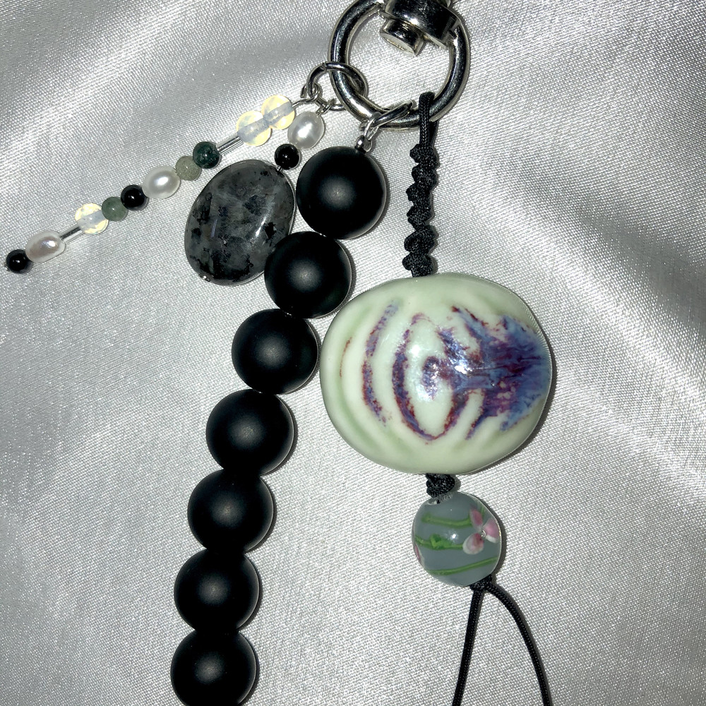 도자기로 만든 보름달 모양의 챰과 오닉스, 담수진주 채도가 낮은 다양한 원석들을 섞어 만들었습니다.