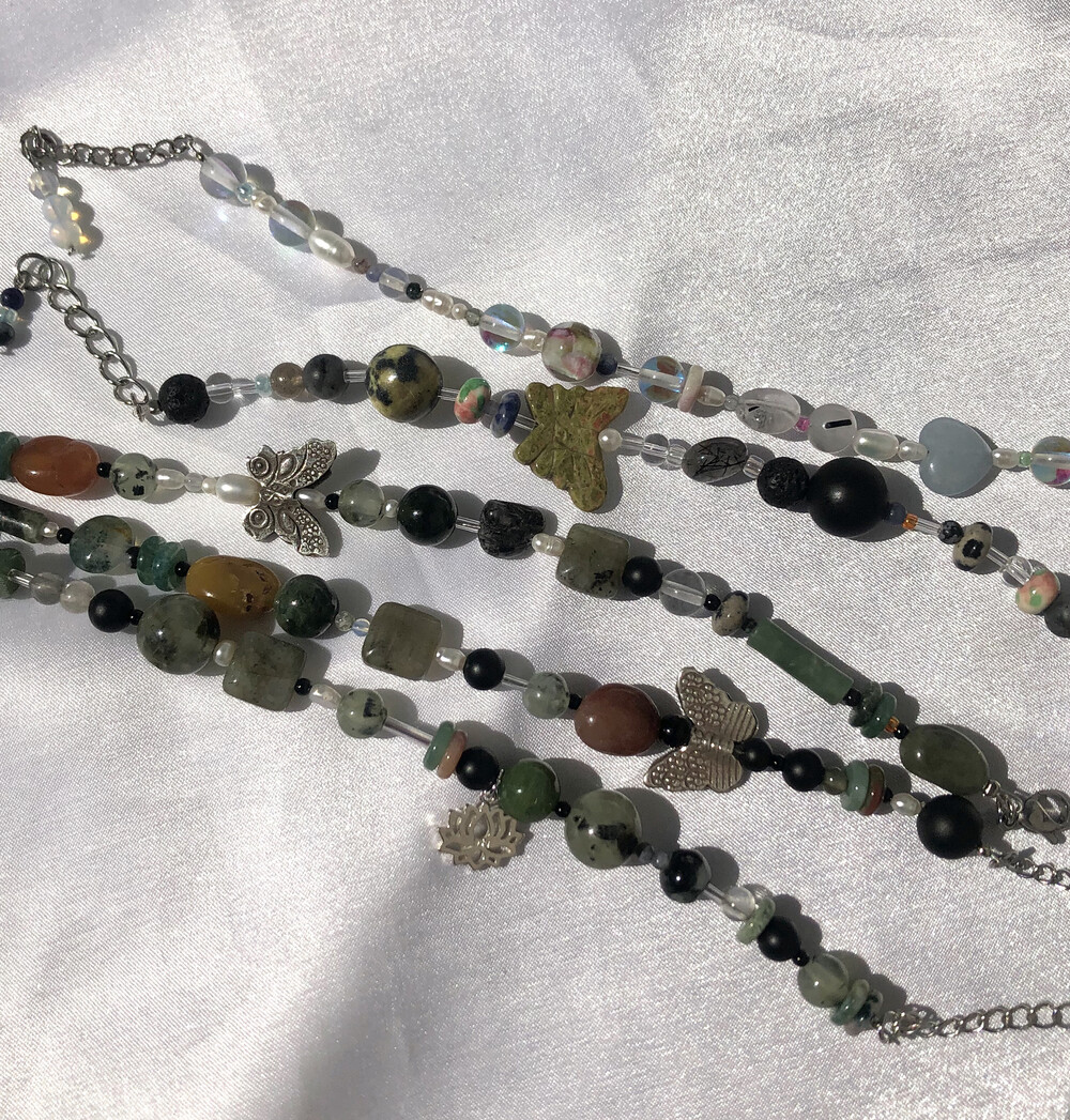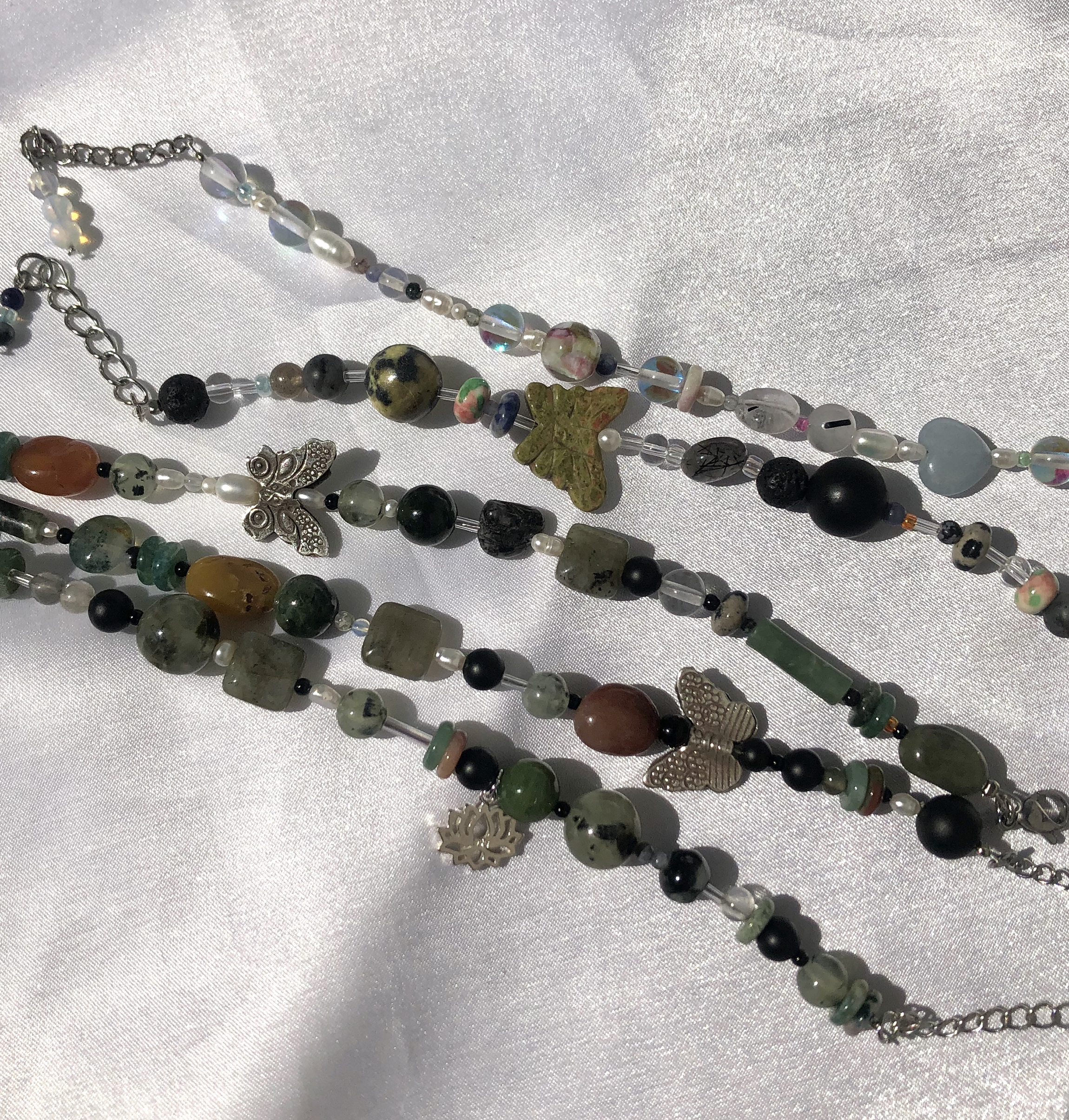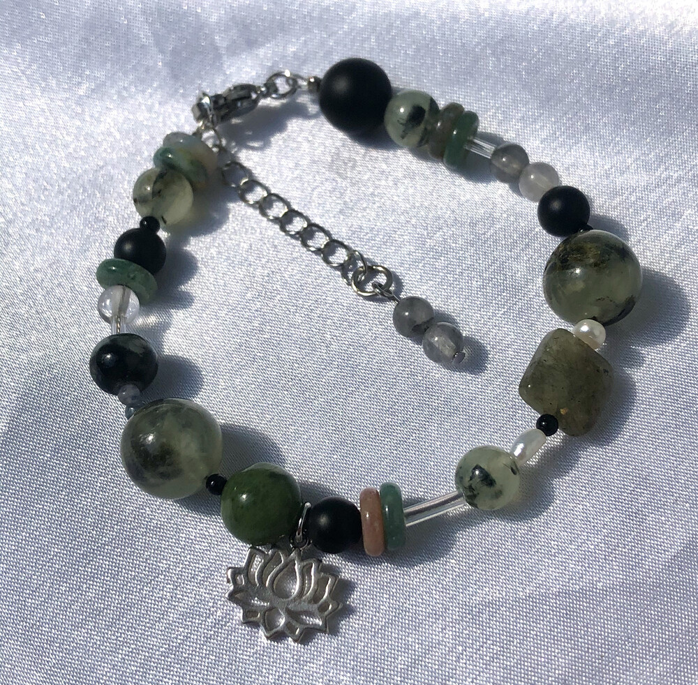 은으로 만든 연꽃 챰과 어둡고 녹녹한 옥과 원석들을 엮었습니다.