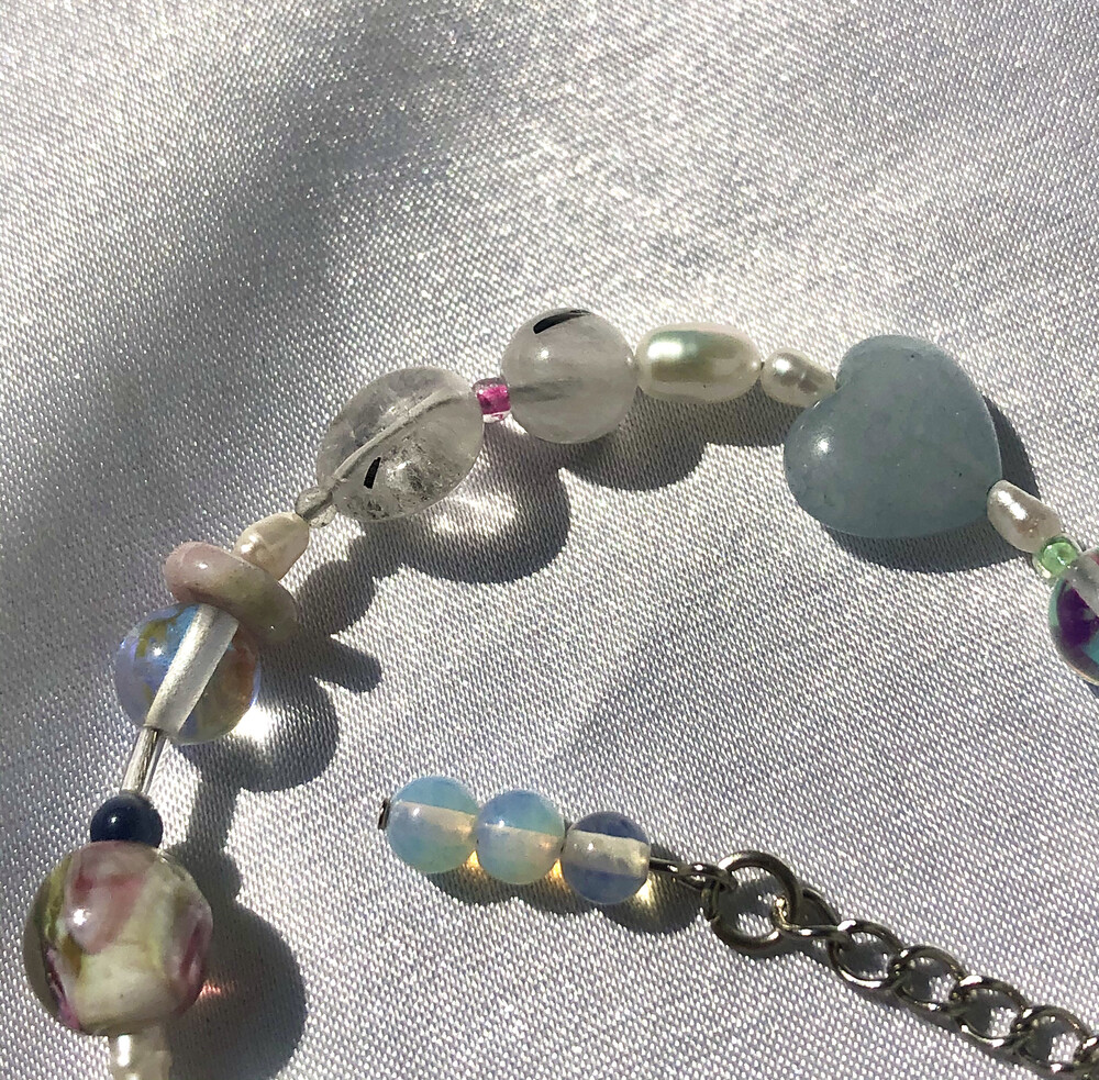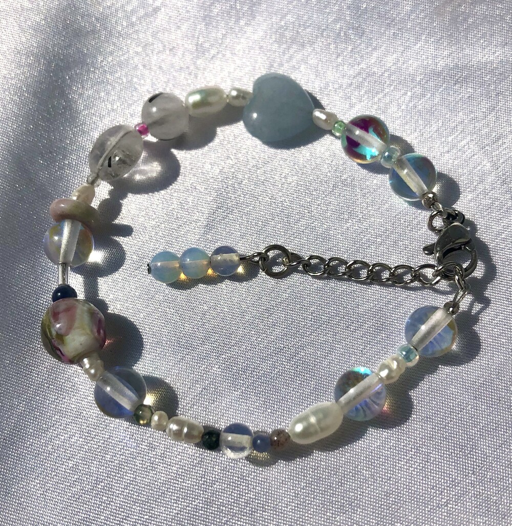 문스톤과 진주가 주를 이룬 팔찌. 빛에 따라 다양한 푸른 빛을 냅니다.