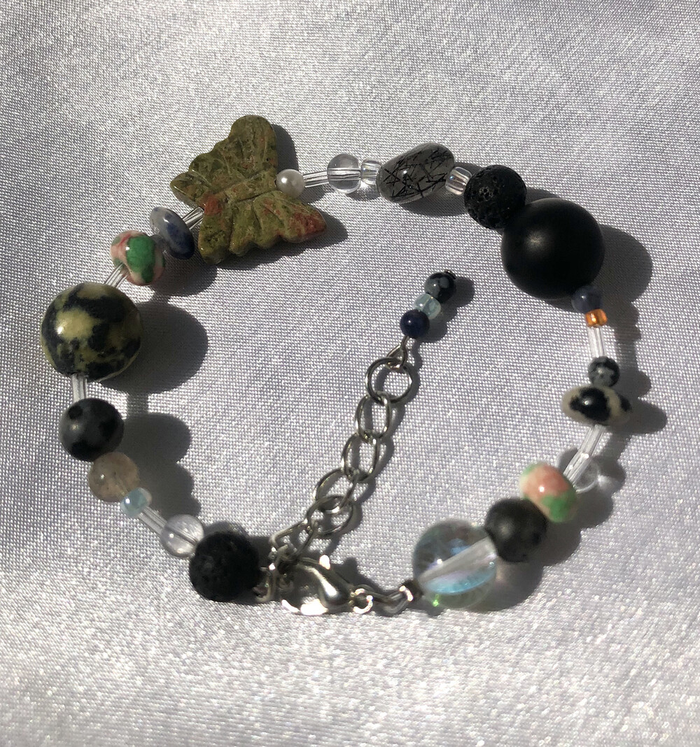 다양한 원석을 사용한 팔찌, 조각한 나비원석을 중심으로 빈티지한 이미지 입니다.
