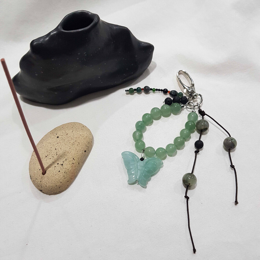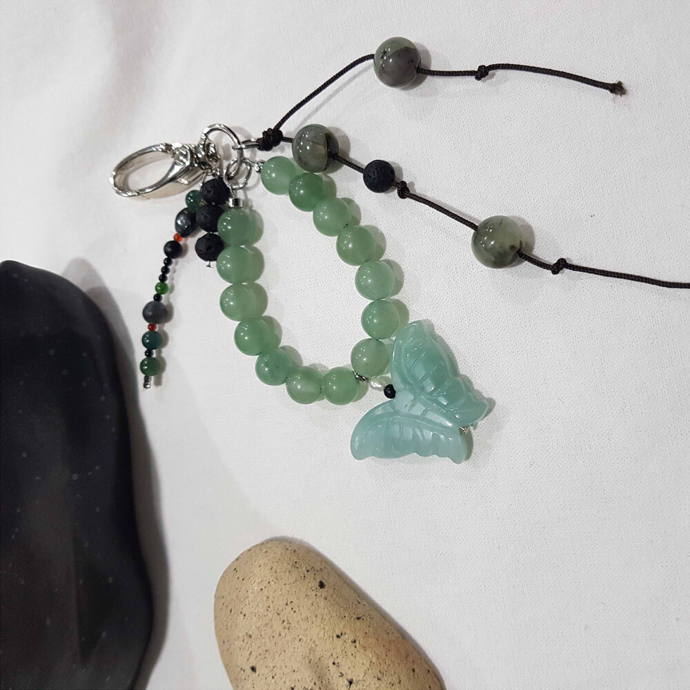 나비원석의 색이 흔하지 않은 살짝 민트색의 원석에 비슷한 톤의 옥으로 줄을 엮었습니다.